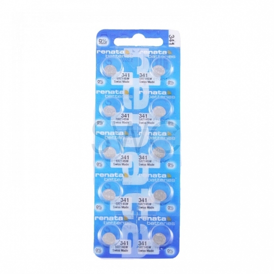Silver oxide low drain battery 1.55 V. Watch Battery 341 measures 7.9X1.4mm. Renata 341 is mercury free and has a capacity of 15 mAh. Must purchase in increments of 10.