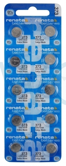 Silver oxide low drain battery 1.55 V. Watch Battery 373 measures 9.5X1.6mm. Renata 373 is mercury free and has a capacity of 29 mAh. Must purchase in increments of 10.