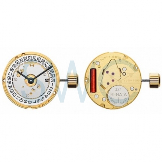 ETA E61-041 Quartz Watch Movement is a 2 hand movement (hour/minute) with a date window @ 3 o'clock. This movement is a ladies round movement 8 1/4 ligne (18.60 mm) with a height of 1.95 mm, movement height H1. Plates are gold colour, 8 jewels, uses 321 battery. Hand dimensions are 120/70 (hour/minute). The best way to determine your movement height is to measure the height of the hour wheel on the movement you are replacing. Movement height H1 has an hour wheel with a height of 1.34 mm.