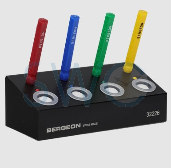 The Bergeon stand is a professional-grade oeiler stand designed to neatly organise and support four oil-applicator pens on the watchmaker’s bench. Crafted from a stable, non-slip synthetic base, the stand securely holds up to four coloured oilers, helping maintain order and reducing risk of tip damage or accidental rolling.The synthetic construction offers durability and ease of cleaning ideal for environments where fine oiling tasks demand spotless surfaces. Its compact footprint ensures minimal bench real-estate, while precisely aligned holders keep each oiler upright and ready for immediate use. Whether you're applying micro-drops of lubricant to pivots, jewels or escapement components, this stand enhances workflow efficiency and professional presentation. As with all Bergeon tools is Swiss-made, delivering reliable quality for the serious horologist or watch repair technician.