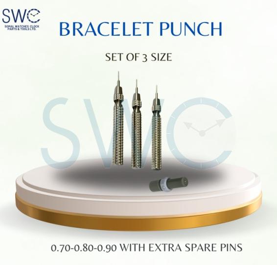 Equip your workbench with this high-precision 3-piece pin punch set, designed for the exacting demands of metal watch-bracelet adjustments. Featuring hardened steel punches in diameters 0.70 mm, 0.80 mm and 0.90 mm, plus extra spare pins, this kit ensures you’re prepared for a wide range of link-pin removal and sizing operations. Each punch delivers controlled, clean force to drive out small bracelet pins without damaging the surrounding links or finish, while the spares guarantee extended usability and quick replacements. Whether you’re resizing luxury wristbands or doing routine maintenance on everyday timepieces, this compact set provides professional-grade tools to maintain precision, speed and quality in your watch-band servicing workflow.