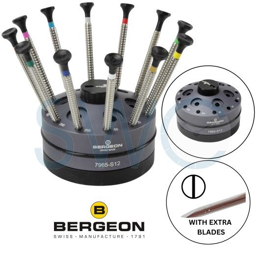 The Bergeon set 7965-S12 comes with 12 of the special profile screwdrivers, spare blades, and rotating stand. The robust, stainless steel body of the special profile screwdrivers - slightly bigger (6mm in diameter) than standard size - with a special pattern etched into the handle for a superb feel and grip. Super strong blades are hardened stainless steel 54 HRC, perfectly finished and held firmly with a set screw. Can be used with the optional, removable 7965-T barrel drum for improved power and control. The drum was designed for the 7965 series and fits all the sizes. Universal color-coded bands on screwdriver handles for blade sizes from 0.60-2.50 mm. Rotating stand has a removable center cylinder that holds spare blades for each screwdriver. The stand also has 6 emplacements for optional dynamometric cylinders (sold separately).