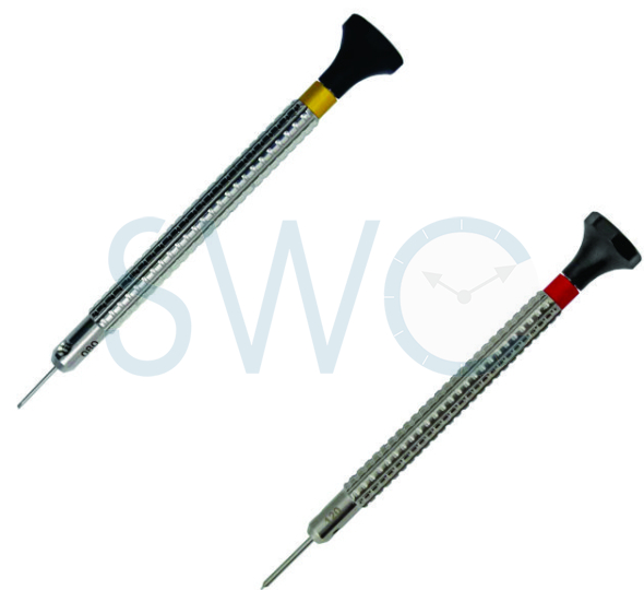 The robust, stainless steel body of the special profile screwdrivers with a special pattern etched into the handle for a superb feel and grip. Super strong blades are hardened stainless steel 54 HRC, perfectly finished and held firmly with a set screw. Universal color-coded bands on screwdriver handles for blade sizes. Sizes offered are 0.50, 0.60, 0.70, 0.80, 0.90, 1.0, 1.10, 1.20, 1.30, 1.40, 1.50, 1.60, 1.80, 2.00, 2.20, 2.50 and 3.00MM