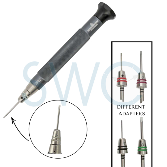 Precision screwdriver features a quick change adapter to easily switch out blade sizes. Great for precise watchmaking and all micro technical applications. Anodized aluminum body features a 8 sided head to prevent it from rolling on the bench surface; blades are made of hardened stainless steel. Sizes include: 1.0, 1.2, 1.4, 1.6, 2.0mm. Quick change adapters are color coded and have reduction sleeves (exterior diameter is 3mm and interior diameter is 0.5 to 2.5mm).