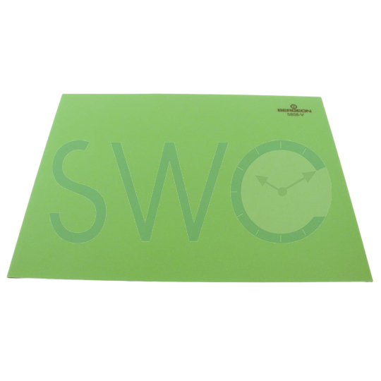 The Bergeon 5808-V-10 bench top work mat provides a clean, stiff, and solvent resistant surface perfect for watchmakers and jewelers. The 320 x 240 x 1.5 mm" inch plastic work pad includes an adhesive backing that can be used to secure the mat in place if needed. The mat is a light-green color that is easy on the eyes and makes small parts or stones easily visible. This light green color has been scientifically proven to reflect the right amount of daylight to ensure that repair people will experience less eye fatigue than with other colors. The mat is made of a thicker plastic than the 6808 and is rigid enough to lie flat, plus it won't scratch or mar any work pieces that may be placed on it, making it a great addition to your workbench.