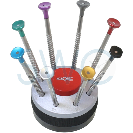 This watchmaker screwdriver set includes 8 precise and durable pieces with a solid aluminium stand, ideal for professional watchmakers.