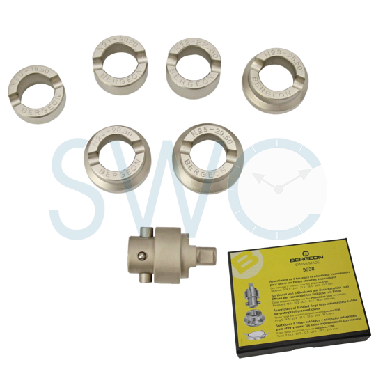 Case opening dies for the Bergeon 5700 Watch Case Opener. To be used on grooved/oyster ring case backs commonly seen on Rolex® watches. Sizes include: 18.5mm, 20.2mm, 22.5mm, 26.5mm, 28.3mm, and 29.5mm. Seven piece set includes six dies and one adapter for attaching to the case opener.