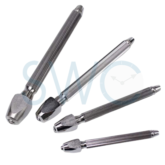 Bergeon 1842-B square head pin vise set contains 4 different pin vises: 80mm (3-1/8"), 100mm (4"), 120mm (4-3/4") and 140mm (5-1/2") long all made of top quality nickel plated brass. Each vise has two steel chucks; openings range from 0 to 5mm. Square heads will lay flat on the workbench so they won't roll off. Comes in a cardboard storage box with slots to hold each pin vise.
