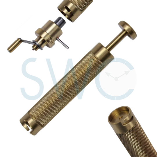 Brass handle holds your drum and arbor while winding a mainspring. The plunger then releases the barrel with spring from the winder. For left hand (counter-clockwise)winders.